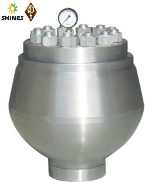 Structure and features: The absorption-type pulsation dampener made by our company is awarded national patent. After coming into market, it has been highly accepted and praised. The unique design and integral forging process and machining made conventional fabrication changed. The product features an oval shape without welding the waist band, which gets rid of the defect caused by the traditional process, greatly improves the integral performance of the device and prolongs the life of the whole unit.