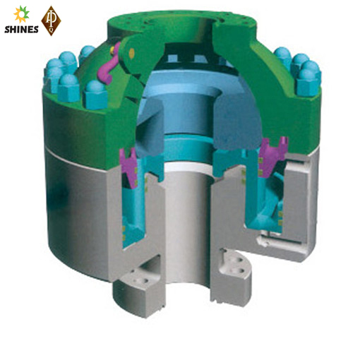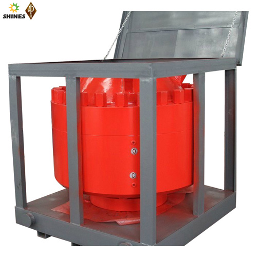 1. 作用 在液壓控制系統(tǒng)配套使用下,當(dāng)井內(nèi)有鉆具時(shí),能封閉不同尺寸的環(huán)形空間;當(dāng)井內(nèi)無鉆具時(shí),能全封閉井口。在此進(jìn)行取心,測(cè)井作業(yè)時(shí)發(fā)生井噴,能封閉方鉆桿,取心工具,電纜,鋼絲繩等與井筒形成的環(huán)形空間。在減壓調(diào)壓閥和緩沖儲(chǔ)能器配合下,能通過學(xué)習(xí)18度無細(xì)扣對(duì)焊鉆桿,進(jìn)行強(qiáng)行起下鉆作業(yè)。